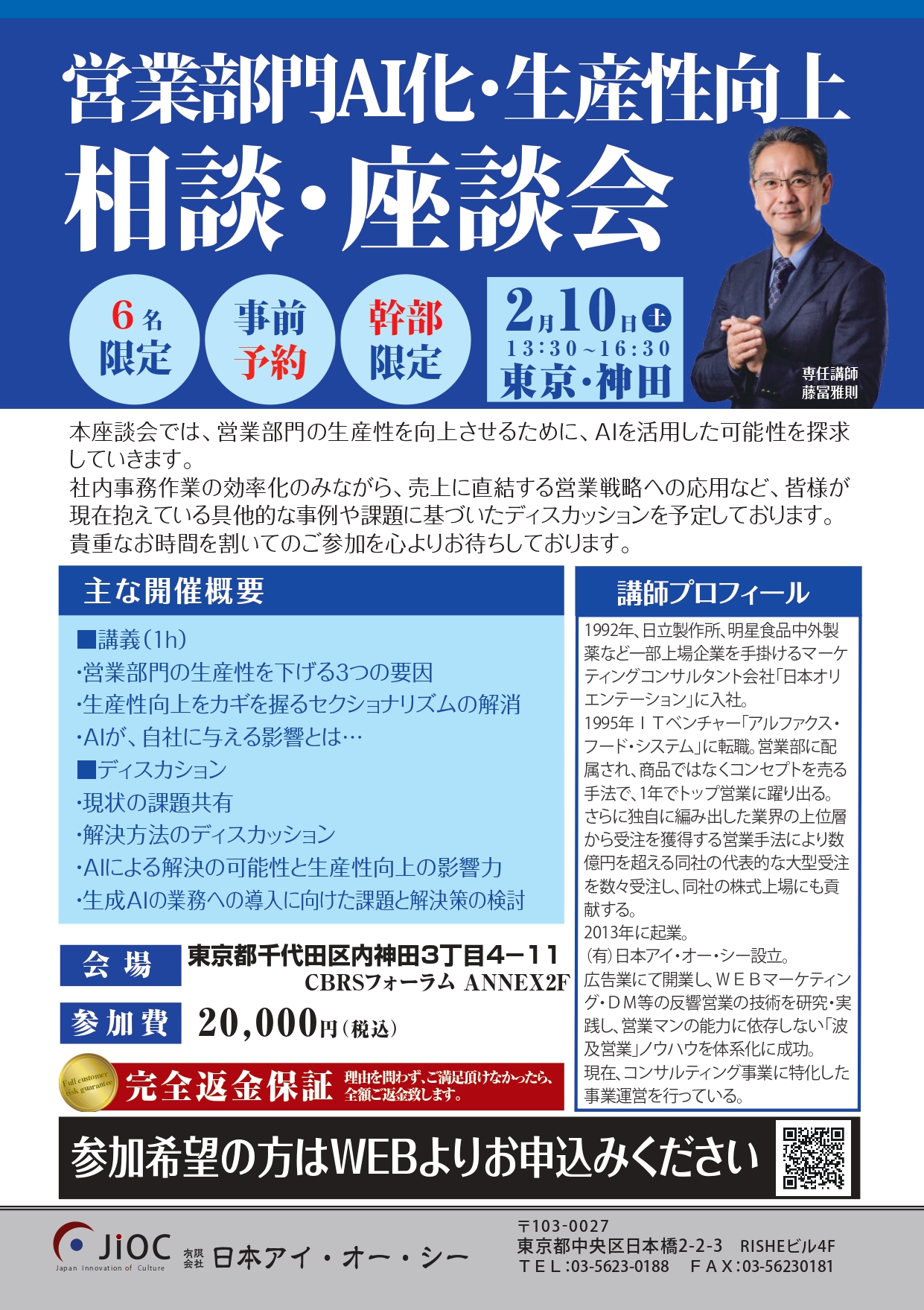 営業部門AI化・生産性向上「個別相談会」 2024/01/31 お知らせ HOME お知らせ 営業部門AI化・生産性向上「個別相談会」 ■お支払いについて お申し込み後、弊社よりメールにてご請求書をお送り致します。開催日前日までにお振込頂ければ幸いです。 ■開催場所について JR神田駅(南口)徒歩、2分のところに会場があります。重厚感のあるテーブルと椅子でゆったりとお座り頂けます。詳細はお申し込み後に、メールにてご案内致します。 お申し込みはコチラから 営業部門AI化・生産性向上相談・座談会 会社名 姓 名 メールアドレス 電話番号 郵便番号 都道府県 北海道 青森県 岩手県 宮城県 秋田県 山形県 福島県 茨城県 栃木県 群馬県 埼玉県 千葉県 東京都 神奈川県 新潟県 富山県 石川県 福井県 山梨県 長野県 岐阜県 静岡県 愛知県 三重県 滋賀県 京都府 大阪府 兵庫県 奈良県 和歌山県 鳥取県 島根県 岡山県 広島県 山口県 徳島県 香川県 愛媛県 高知県 福岡県 佐賀県 長崎県 熊本県 大分県 宮崎県 鹿児島県 沖縄県 住所 部署名 お役職 投稿ナビゲーション 【部門横断チームで稼ぐ組織を育成する】マスタープログラム講座|3月22日開催決定!