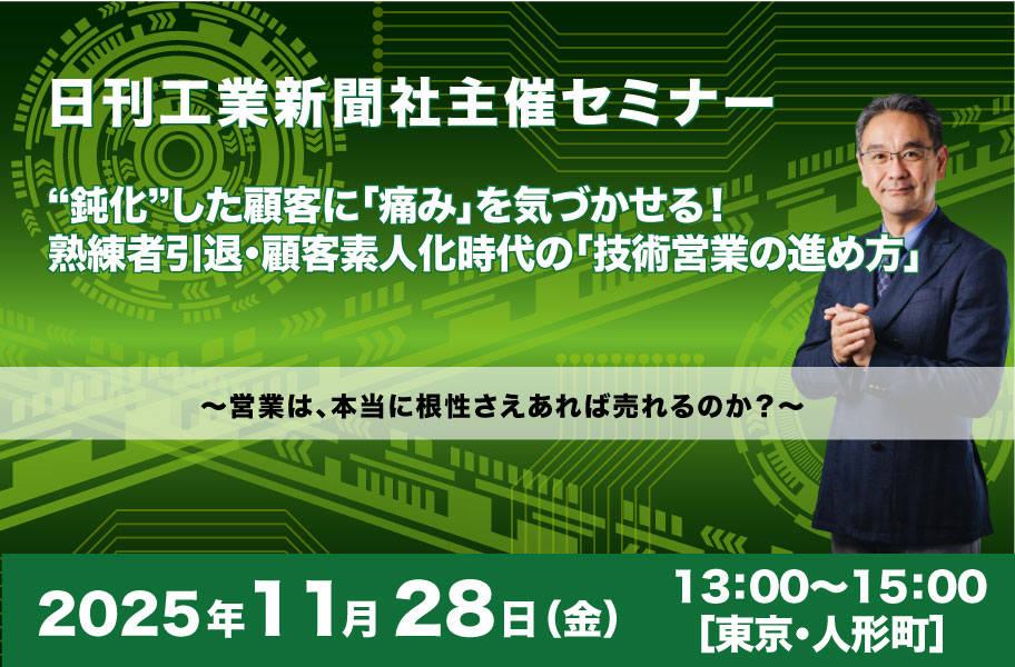 お申し込みは、日刊工業新聞社のHPよりお願いします。 https://corp.nikkan.co.jp/seminars/view/7464 ※同日開催のキーエンス流・顧客から「断る選択肢」を奪う「技術営業法」にセットで参加される場合は、セット価格38,500円でご参加頂けます。 |